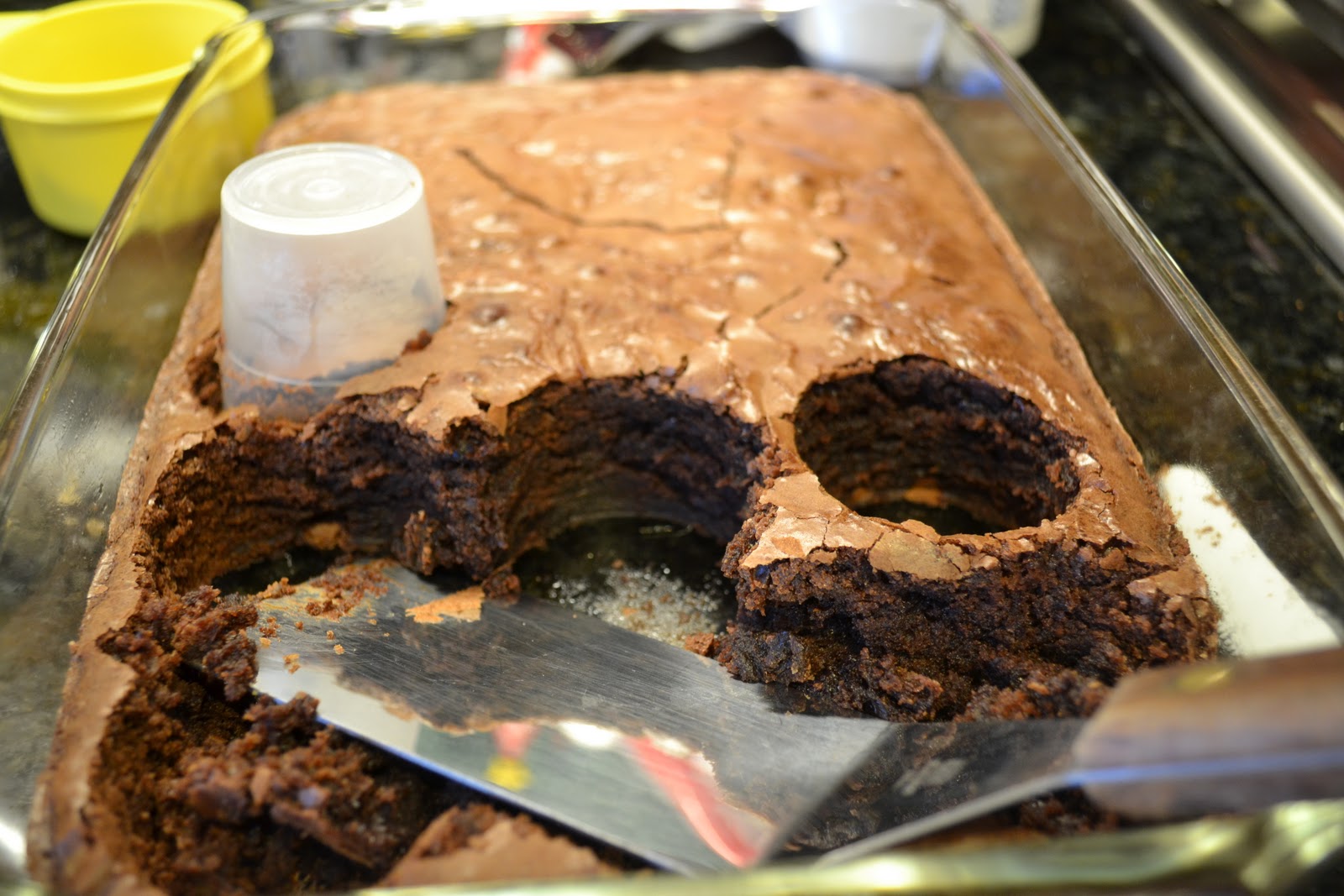4. Cut out the brownies in circular shapes. I used a small cup, and a spatula to get them out. Also, using a plastic knife, instead of a metal knife, prevents the brownies from sticking to the utensil!